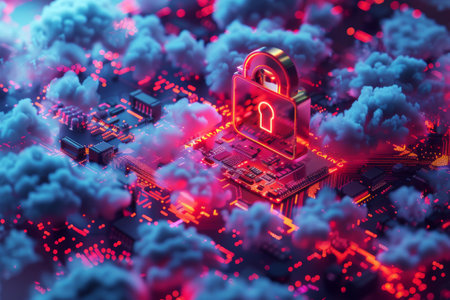 A vibrant image displaying a glowing padlock on a microchip, depicting concepts of cloud computing security and digital encryption.