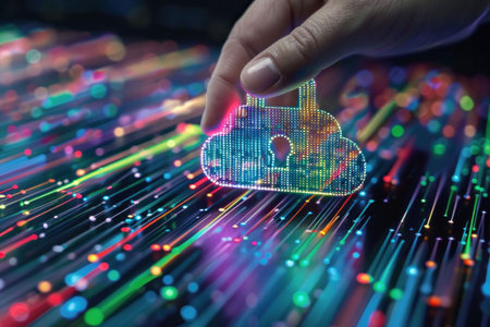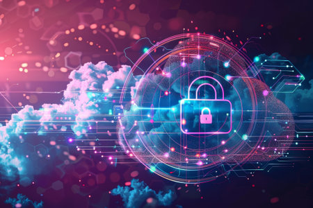 A colorful image of a cloud with a blue lock on it. The lock is surrounded by a lot of lights and the image has a futuristic feel to it