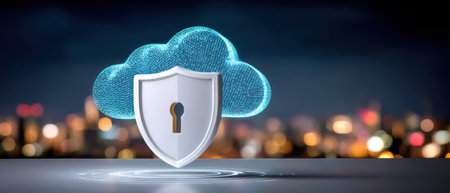 Cloud security data shield protecting digital infrastructure with lock icon abstract city night
