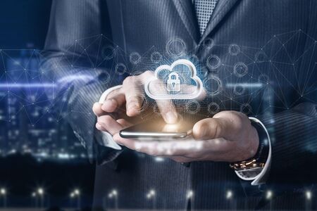 In the right hand of a man in a suit, there is a cloud computing symbol, and the left hand holds a mobile phone,the concept of security of Internet sharing.