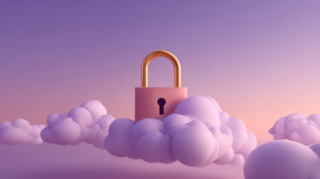 Digital security concept featuring a pink padlock resting on fluffy clouds with a gradient sky in the background, symbolizing online safety and protection