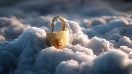 Golden padlock resting on fluffy clouds in a dreamy sky with soft light, representing security, protection, and tranquility in surreal landscape