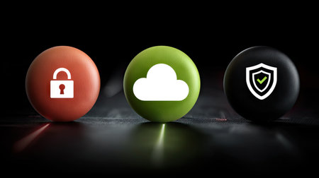 This image features three distinct icons representing security concepts in technology: a lock for security, a cloud for data storage, and a shield for protection.