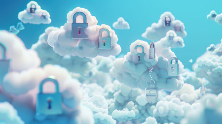 Whimsical 3D illustration of secure cloud computing, depicted by padlocks floating amongst fluffy clouds in a serene blue sky.