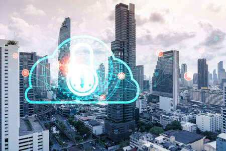 Padlock icon hologram over panorama city view of Bangkok to protect business in Asia. The concept of information security shields. Double exposure.