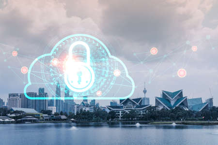 Padlock icon hologram over panorama city view of Kuala Lumpur to protect business, Malaysia, Asia. The concept of information security shields. Double exposure.