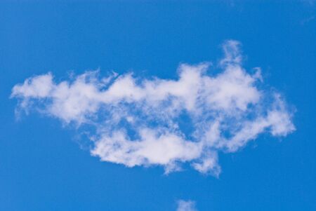 A lonely light cloud hovering above the ground on a dark blue background. Looking up at the sky in hopes of a sign from above. Gradual sailing with the wind in search of oneself. Meditative picture.