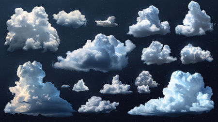 Abstract white clouds isolated on blue background. Weather forecast symbol. Cumulus clip art set. Design elements for the sky..