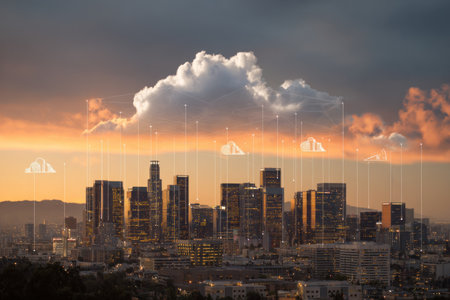 A modern city skyline at sunset is overlaid with glowing cloud icons and connection lines. The image reflects smart city evolution and the rise of cloud computing infrastructure.