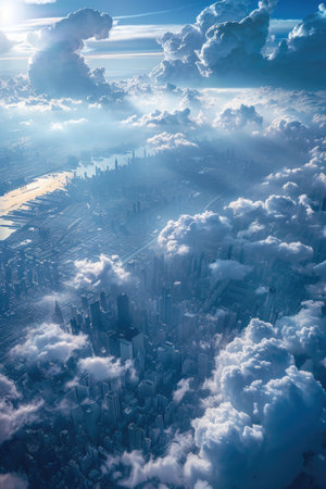 A serene city hovers amidst clouds, blending tranquility with liveliness.