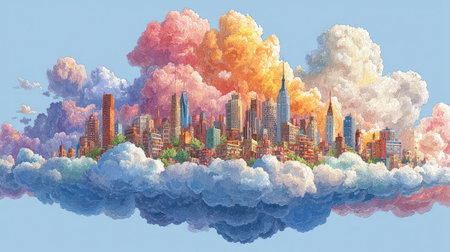 An illustrated cityscape appears to emerge from a formation of vibrant clouds. The composition features tall buildings set amidst puffy formations of pink, orange, and white. The artwork displays a soft, dreamlike aesthetic, with an open sky background. Suitable for various creative projects and editorial content.