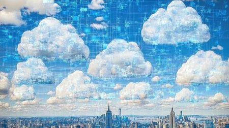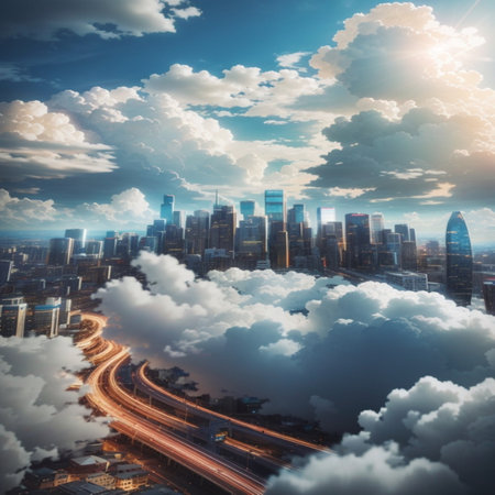 A stunning city skyline features digital clouds and a bright blue sky, showcasing the blend of urban life and modern technology in a vibrant scene.