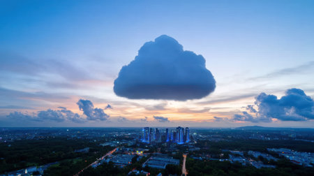 A prominent cloud, symbolizing cloud computing, hovers over a modern city, illustrating the integration of technology and urban development.