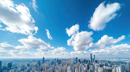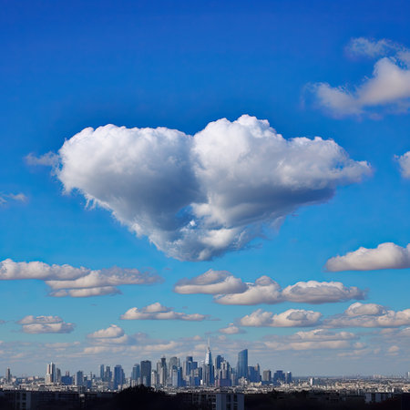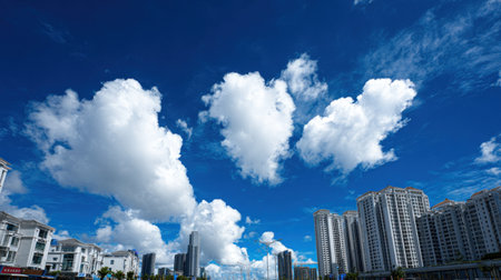 The image showcases a bright blue sky filled with puffy white clouds, creating a contrasting backdrop. Modern buildings are visible at the horizon. The composition uses natural light. Suitable for various projects, it is ideal for commercial or editorial applications needing sky or architecture visuals.
