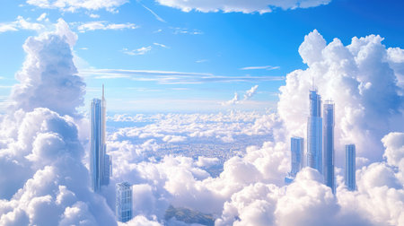A stunning cloudscape with towering skyscrapers reaching into the vibrant blue sky, creating a surreal and peaceful atmosphere perfect for inspiration and creativity.