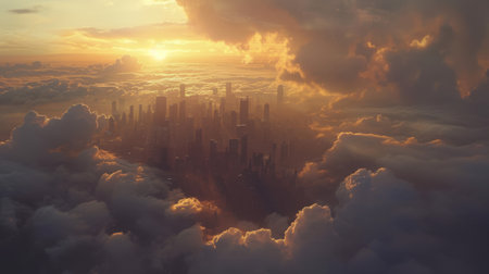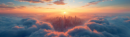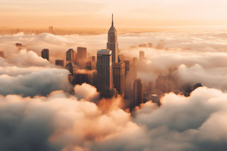 An awe-inspiring aerial perspective captures a sprawling city skyline partially obscured by a thick, ethereal blanket of morning fog. The tops of skyscrapers and taller buildings emerge from the mist like islands in a sea of white, creating a mysterious and serene atmosphere. The soft, diffused light of dawn casts a gentle glow, highlighting the vastness of the urban landscape. conveys a sense of quiet grandeur and the hidden potential within the city.