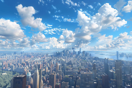 A stunning view of city skyline under bright blue sky with fluffy clouds