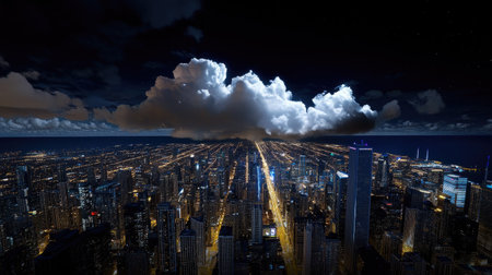 A breathtaking view of a city skyline at night, featuring illuminated streets and dramatic clouds. This high-angle perspective captures urban beauty amidst a moody atmosphere.