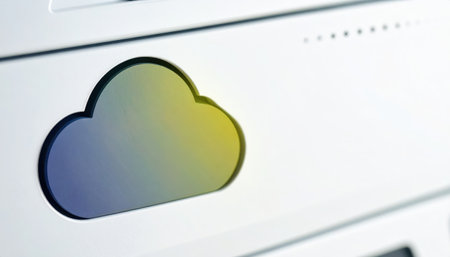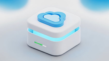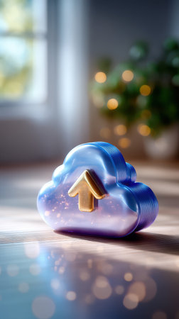 A close-up view presents a blue cube with a white cloud symbol and an upward-pointing arrow, placed on a laptop keyboard. The visual showcases a technological theme with soft lighting and a blurred background. Suitable for illustrative purposes related to data storage, technology, and business.
