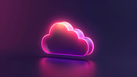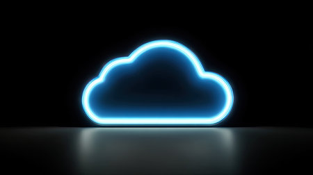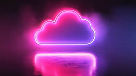A glowing neon cloud icon is displayed against a dark backdrop. The composition features a vibrant blue outline, reflecting light on a glossy surface below. This visual emphasizes a digital or technological concept, potentially suitable for presentations or illustrative design. The image offers commercial potential for various applications.
