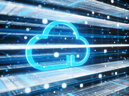 A modern cloud computing concept featuring neon lights and digital elements, symbolizing data storage and connectivity in a high-tech digital landscape.