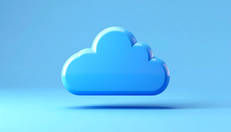 A three-dimensional render depicts a cloud symbol with an upward arrow. The design features a square shape, a vibrant blue color, and white elements. The illustration has a modern style against a dark background, suggesting digital environments and data transfer. Suitable for various commercial and editorial applications.
