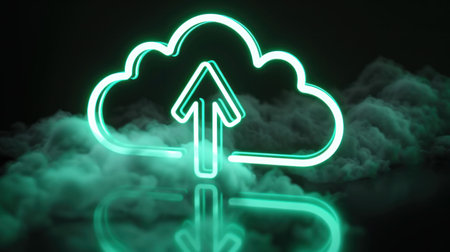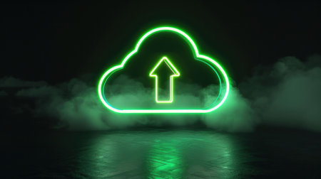 Neon cloud upload symbol with an arrow, glowing against a dark background, surrounded by mist for a digital concept