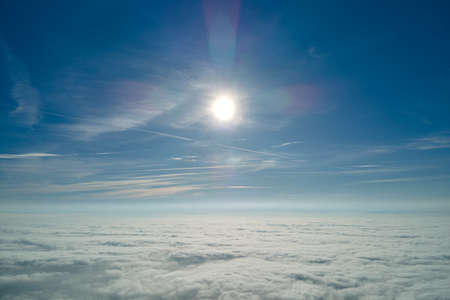 Flight over the clouds with blue sky and sunshine