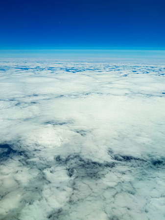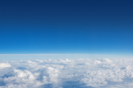 The beautiful cloudscape with clear blue sky. Panorama above white clouds as seen through window of an aircraft. A view from airplane window