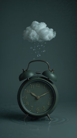 A vintage green alarm clock with a miniature rain cloud hovering above, dripping water droplets. The scene conveys a surreal and melancholic mood on a dark backdrop.