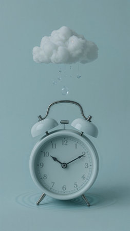 White vintage-style alarm clock placed under a fluffy cloud with raindrops falling, set against a pastel blue background. Surreal and creative concept.