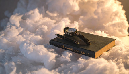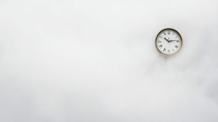 A clock emerges from soft fog and mist, creating a tranquil scene that signifies the passage of time and evokes a sense of serene reflection.