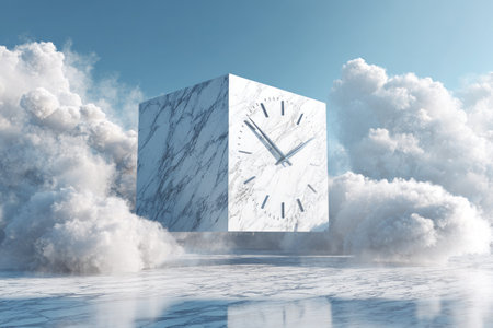 Large, square, marble clock is suspended in mid-air, surrounded by billowing clouds against a pale blue sky. The clock's surface reflects the sky and clouds, creating a serene and surreal scene. A sense of tranquility and timelessness is evoked by the image.