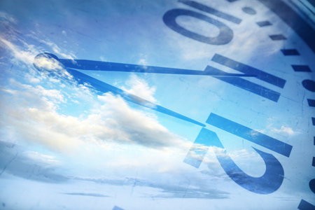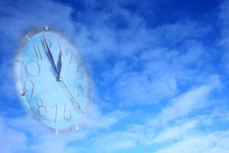 Conceptual image with clock against cloudy sky background