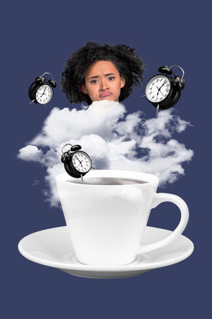 Creative retro 3d magazine collage image of unhappy upset lady felling tired waking up morning coffee isolated blue color background
