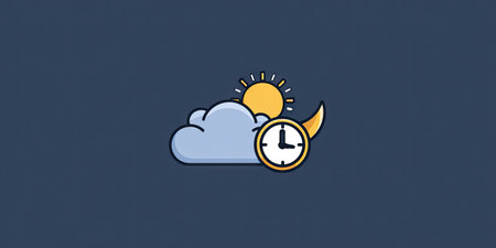 An illustrated weather icon presents a sun peeking through clouds alongside a crescent moon and a clock face. The design uses a flat, graphic style with a limited color palette. This image would be suited for various visual communication tasks, especially those concerning weather or time information.
