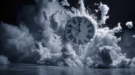 An antique clock is enveloped by a voluminous white cloud, creating a dynamic visual effect. The image features a monochromatic color scheme, dramatic lighting, and a sense of movement. The composition suggests a surreal or conceptual theme, suitable for various artistic or commercial applications.