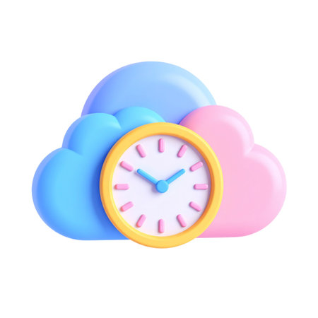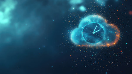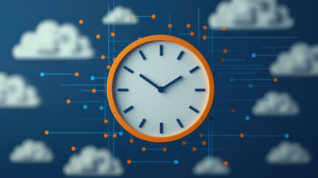 A modern clock surrounded by stylized clouds, symbolizing the concept of time in a digital or cloud computing context.
