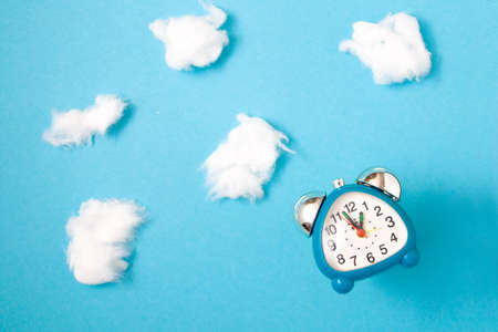 blue alarm clock and clouds of cotton on a blue background, copy space, morning awakening, soar in the clouds, lose time concept, detect time, rest and sleep time
