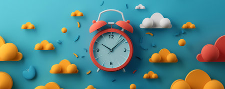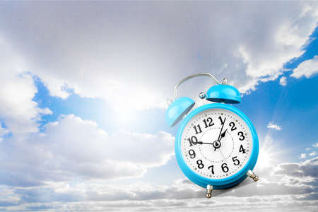 3d rendering of an alarm clock on a blue background with clouds