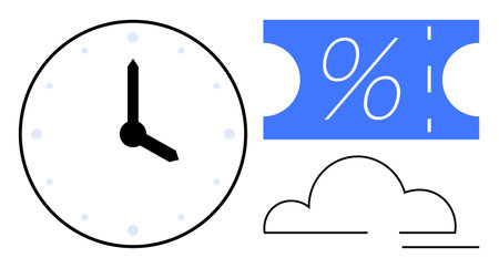 Analog clock showing time, blue discount coupon with percentage sign, and a cloud outline. Ideal for time management, promotions, savings, cloud services, productivity, digital content and network