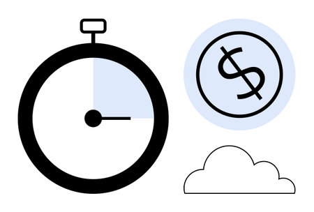 Black stopwatch with blue highlight, dollar sign in a blue circle, and a simple cloud icon. Ideal for productivity, finance, time management, cloud storage, efficiency, cost-saving modern digital