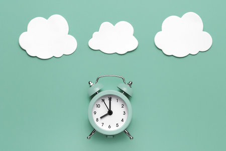 Classic round alarm clock and white clouds on the mint green background