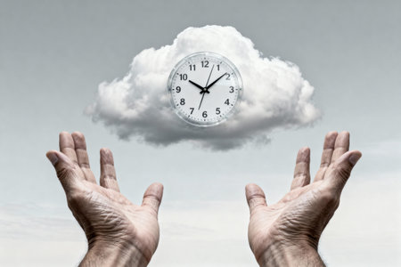 An image of hands outstretched towards a clock that is floating in a cloud, symbolizing time and concepts.