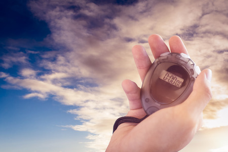 Close up of coach is holding a stopwatch against cloudy sky over countryside