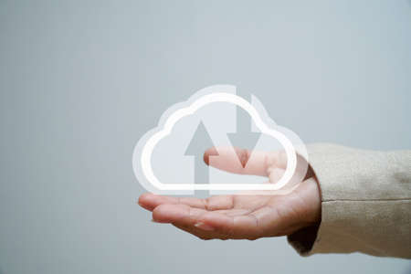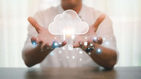 Man touching connect to data information on the Cloud Computing Technology Internet Storage Network Concept And a large database big data Through internet technology, Cloud sharing download and upload