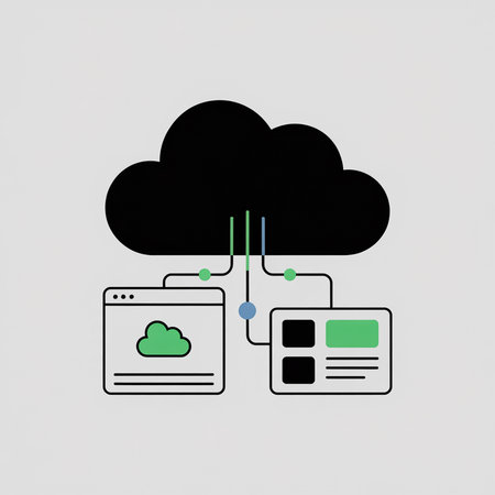 Minimalist illustration depicting a black cloud connected to green and black devices via lines and dots suggesting data transfer a clean and simple design