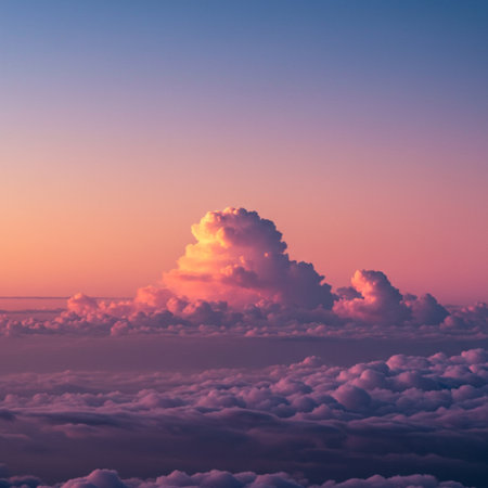Experience the breathtaking beauty of a sunset illuminating fluffy clouds in the sky, casting soft colors and creating a serene atmosphere reminiscent of nature's calm.