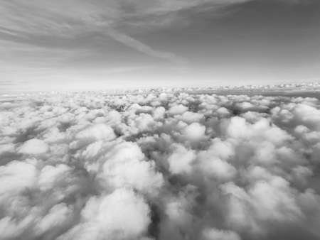View from the plane to white volumetric thunderclouds and the space of the stratosphere, black and white, top view. Beautiful natural sky background. Sky backdrop for your photos