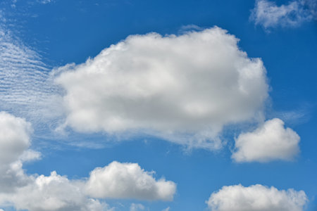 Beautiful cumulus clouds against the blue daytime sky. Cumulus is a fluffy cloud like a cotton ball